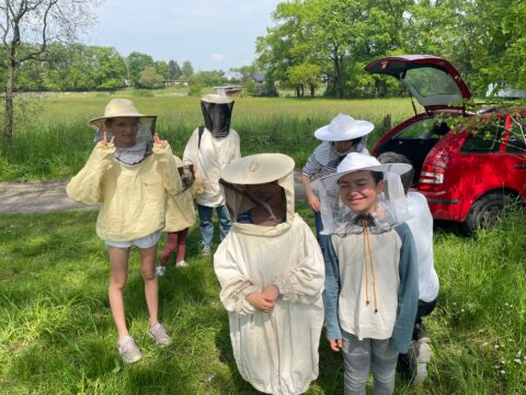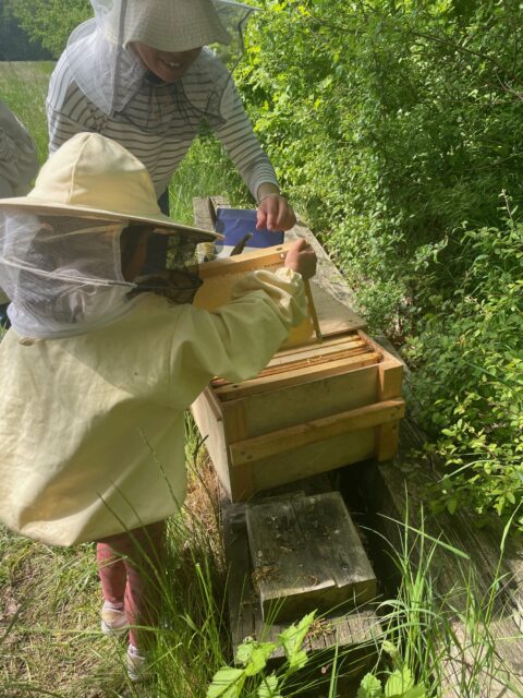 ウォルフスブルクにお住まいの浅野ヴィアト家を訪問しました。アルブレヒト・ヴィアトさんのご実家は、何世代にも渡って、趣味で養蜂を手がけている養蜂家です。まず、養蜂場を訪問し、蜜蜂の生態や巣箱の仕組みについてお話しいただきました。その後、保護服を着た子供たちが、いざ挑戦!無数の蜜蜂を目の前に、ドキドキしながらも、言われた通りに落ち着いてブラシでゆっくり蜜蜂を巣枠から払い落とし、巣枠を箱に入れます。