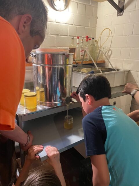 次に、蜜が収納された巣枠を遠心分離器にかけ、最後は、樽にたまった金色に光り輝くハチミツを、瓶いっぱいに詰めて、持ち帰らせていただきました。 普段、食べているハチミツがどのように作られ、どんな経緯を経て食卓に出るのか、自然と人間との共同作業で作り出すハチミツづくりを見て聞いて実践した子供たちは、きっと一生忘れない、甘い体験になったことでしょう。