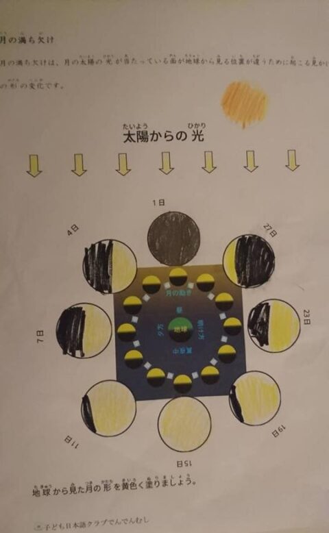 ドイツの現地校ではあまり実験をしないという保護者の声を聞いて、「デュースブルグ日本語学校でんでんむし」小学生クラスの子どもたちと、私が小学校の頃にやった「月の満ち欠け実験」を再現しました。